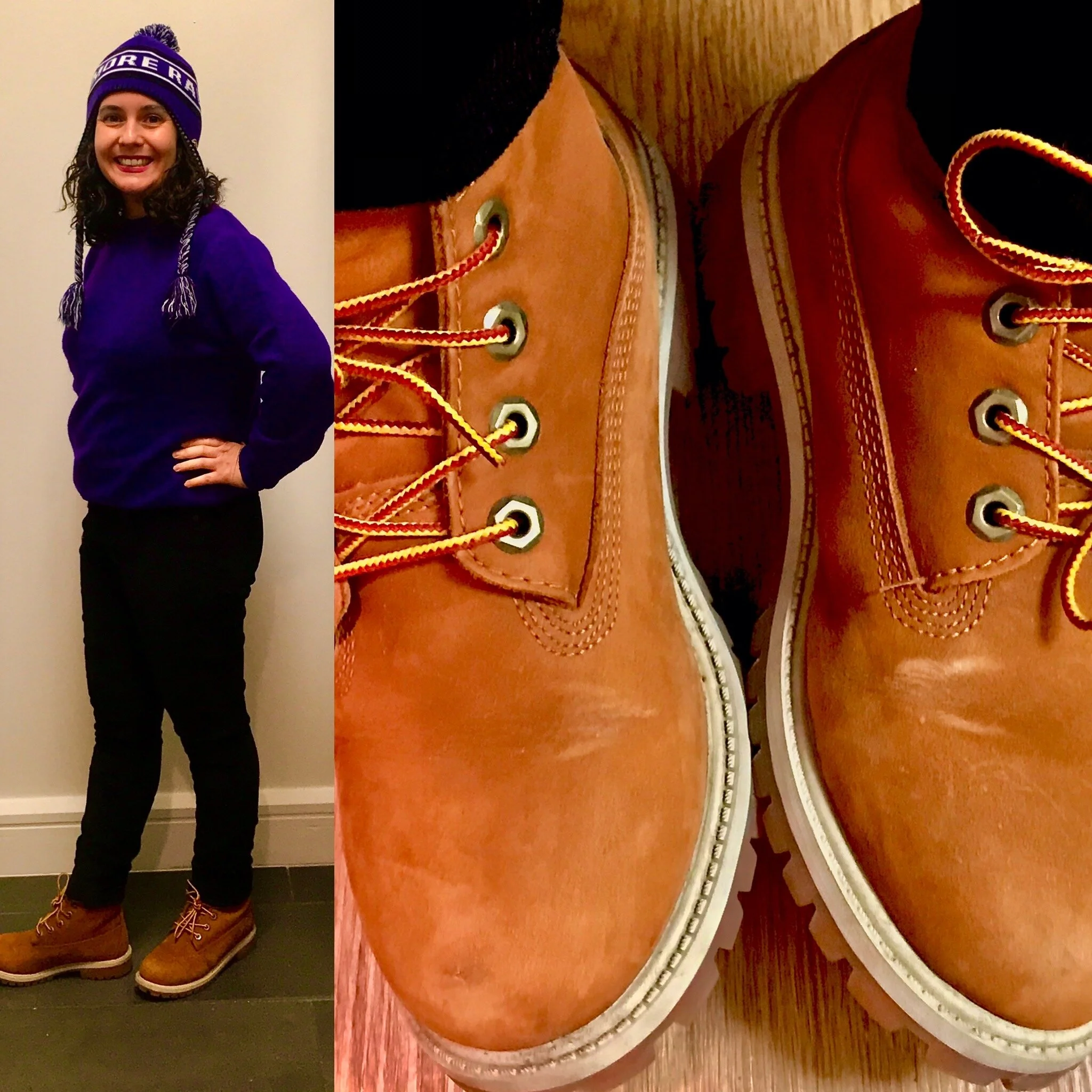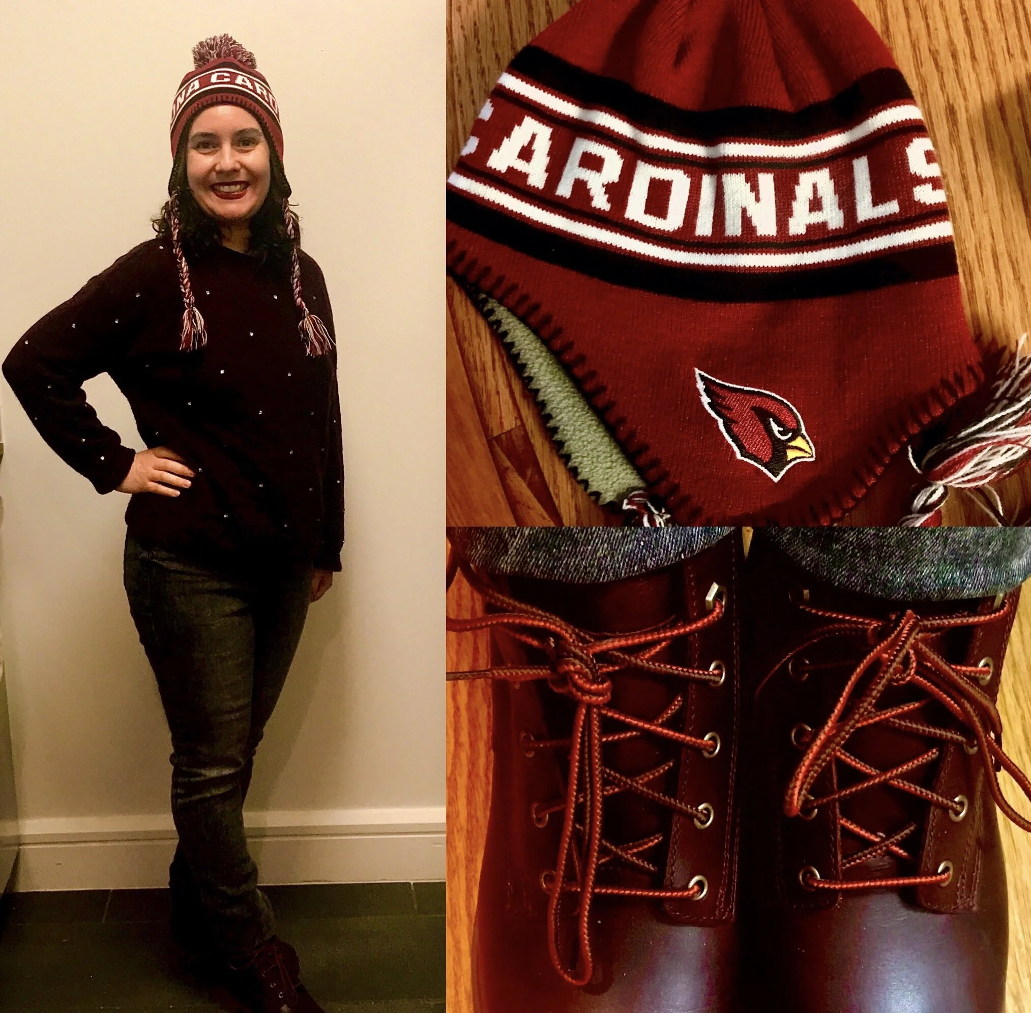Arizona Hat: Fanatics.com, Sweater: H&M, Jeans: Old Navy, Women’s Jayne Timberlands