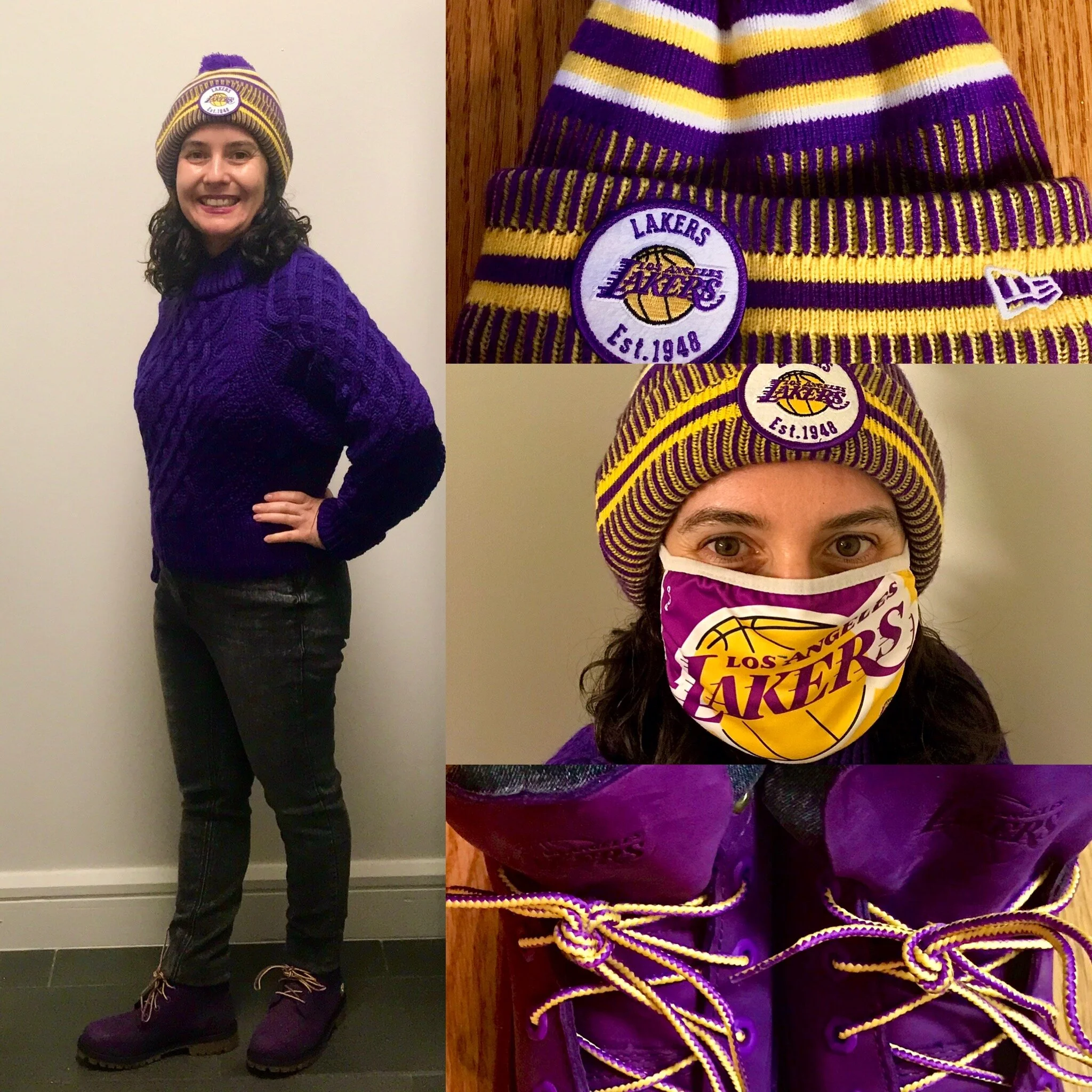 Los Angeles Hat: Fanatics.com, Mask: Fanatics.com, Sweater: H&M, Jeans: Old Navy , Grade School NBA/Timberlands